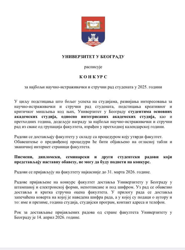 обавештавамо вас да је расписан конкурс за најбољи научно-истраживачки и стручни рад студената у 2025. години, који је објављен на званичној интернет страници Универзитета у Београду, а који је расписан у складу са одлуком Сената од 25. фебруара 2026. године и спроводи се у складу са Правилником о награђивању студената Универзитета у Београду.