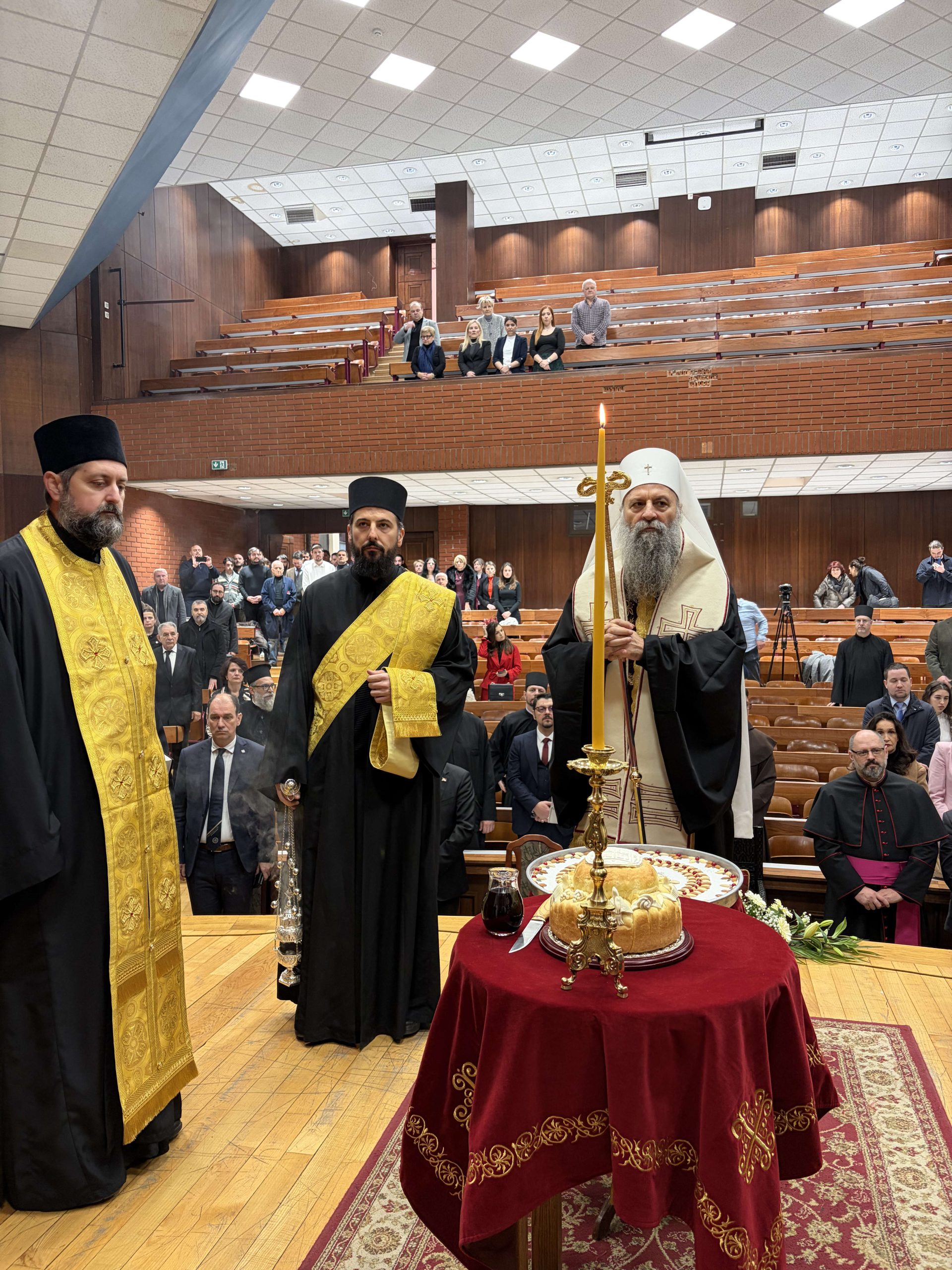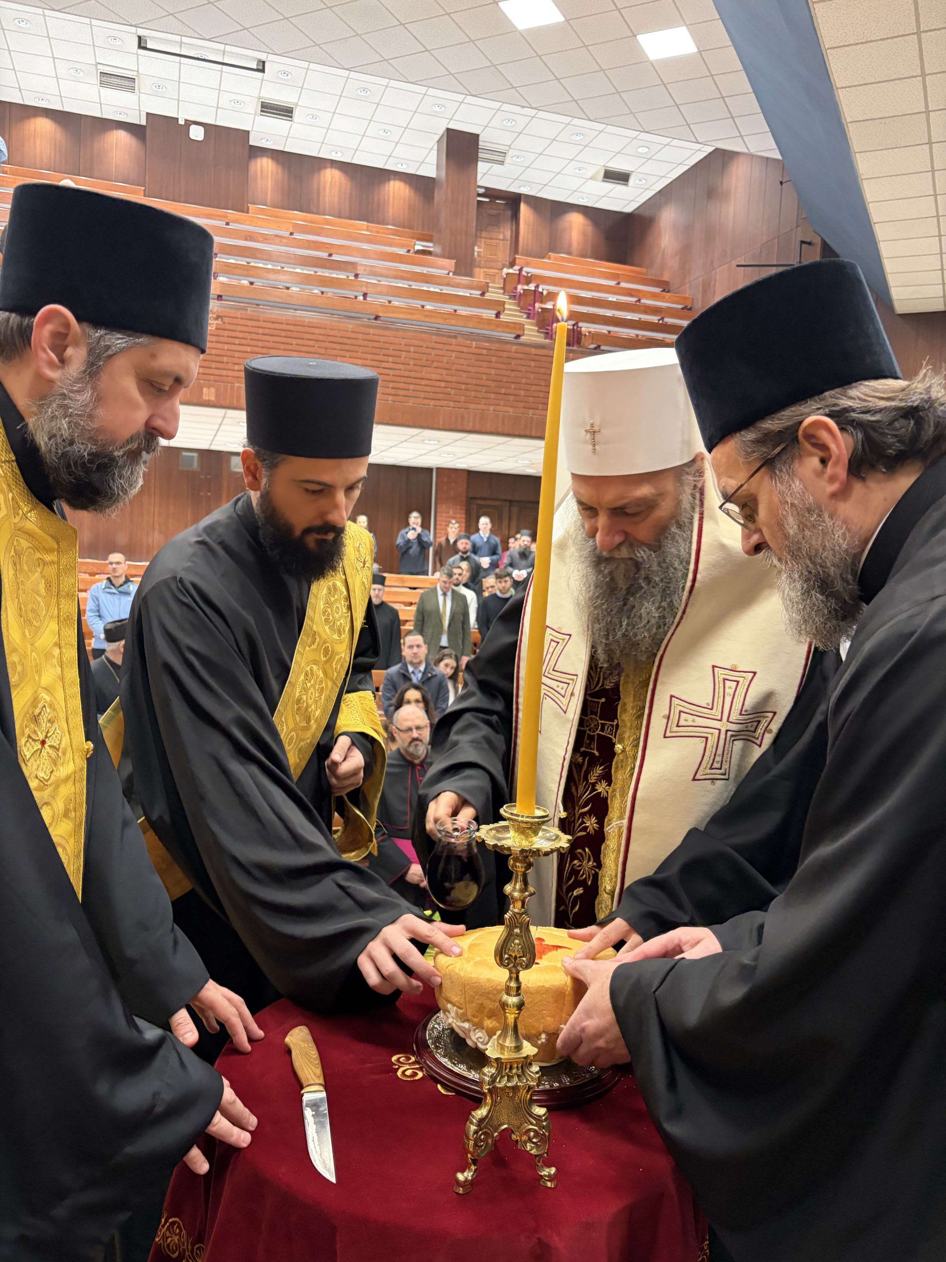 Радост празника је потом умножена и у просторијама Факултета, где је после Свете Литургије уприличена традиционална Светосавска академија. Академија је отпочела чином благосиљања славског кољива и ломљења славског колача, којим је предстојао Његова Светост Патријарх српски господин Порфирије.