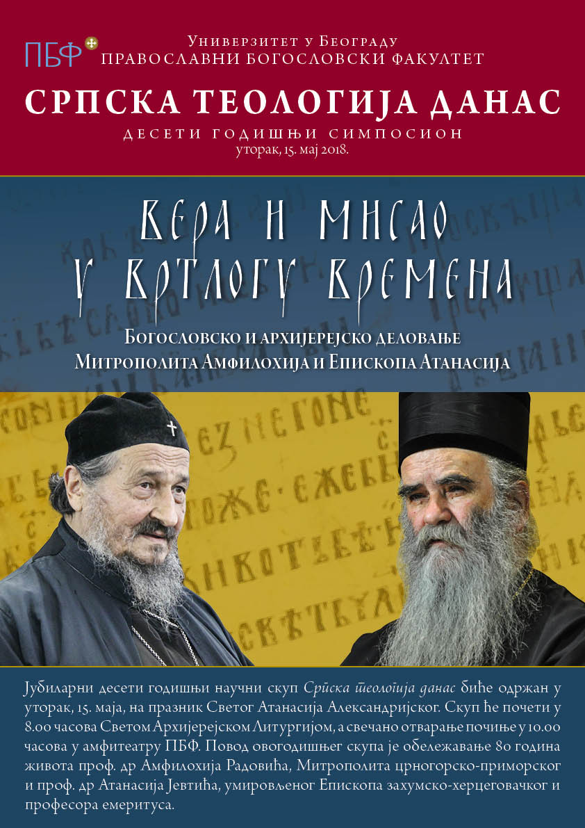 У уторак, 15. маја 2018, на празник Светог Атанасија Великог Александријског на Православном богословском факултету у Београду одржан је јубиларни десети годишњи симпосион Српска теологија данас под симболичним називом Вера и мисао у вртлогу времена. Поводом осамдесетог рођендана двојице великана српске теологије и стубова нашег факултета у протеклих педесет година, Митрополита Амфилохија и Владике Атанасија, овогодишњи скуп је окупио њихове настављаче и поштоваоце који су изложили своју рецепцију њиховог богословског и архијерејског деловања.