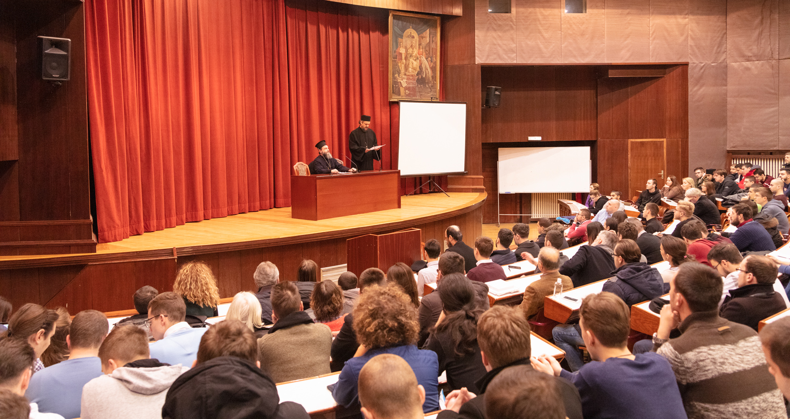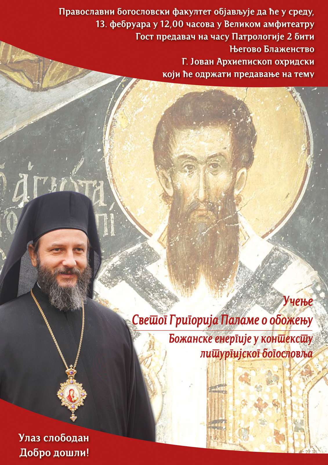 По благослову Његовог Преосвештенства епископа браничевског проф. др Игнатија, декана Православног богословског факултета, данас је Његово Блаженство Архиепископ охридски и Митрополит скопски Г. Јован у великом амфитеатру Православног богословског факултета одржао предавање на тему "Учење светог Григорија Паламе о обожењу - божанске енергије у контексту литургијског богословља".